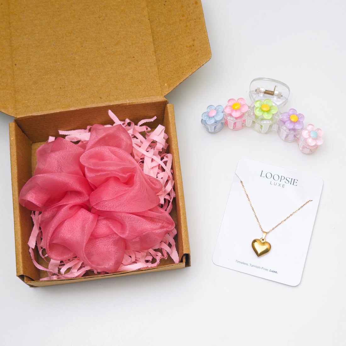 Golden Heart Necklace Gift Hamper for Girls โ Scrunchie & Flower Hair Claw