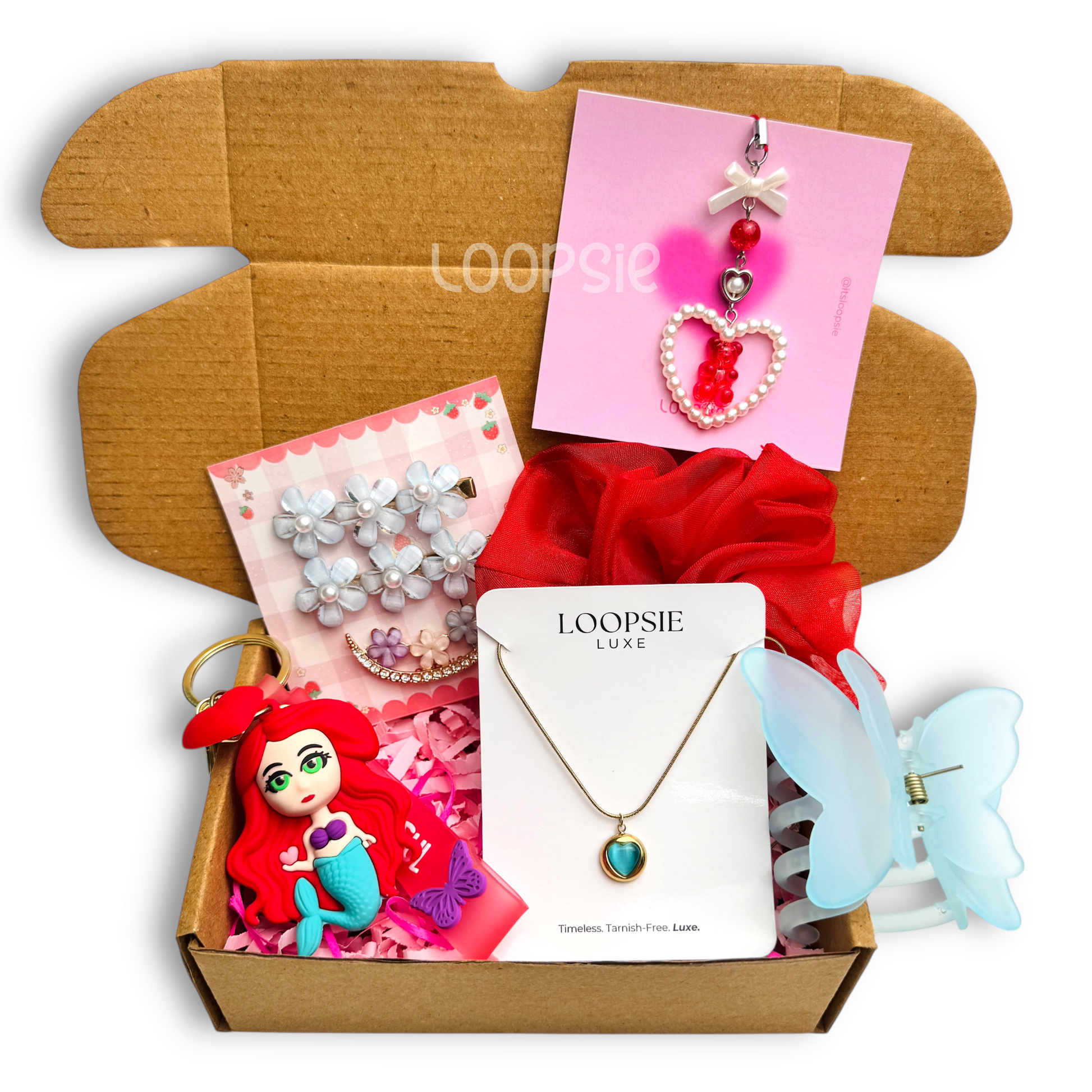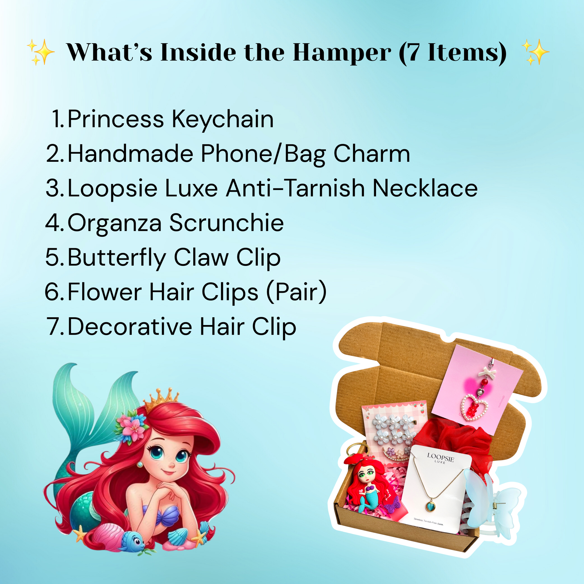 DIVE INTO MAGIC π§ββοΈβ¨ The Ariel Princess Gift Box is a vibrant ocean-inspired hamper with pops of red and blue. Filled with sparkling accessories, jewelry, and handmade charms, this set makes the perfect gift for birthdays, festivals, or surprise moments for little mermaids and teens alike.