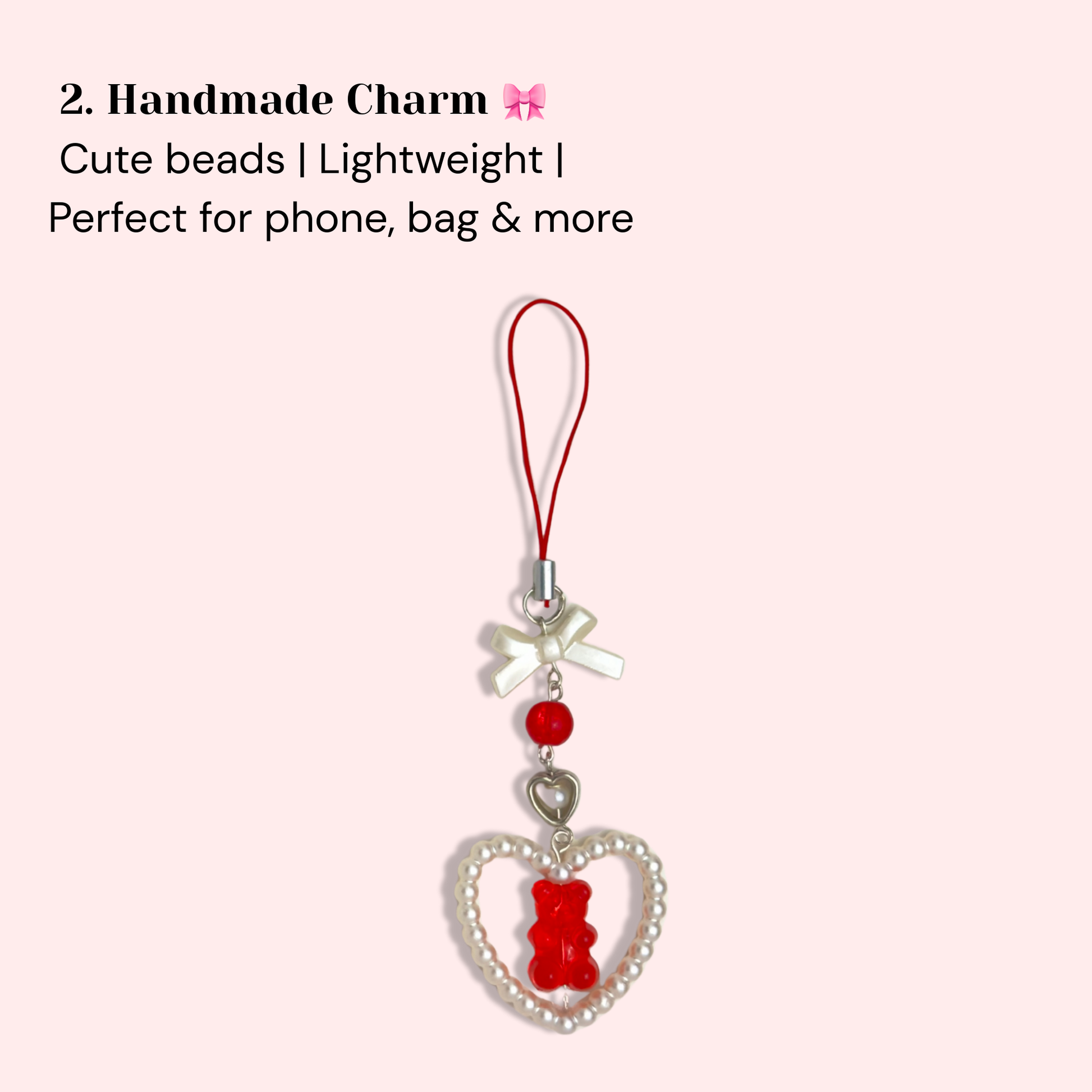 - 1 Handmade Beaded Phone/Bag Charm in red with pearl heart
