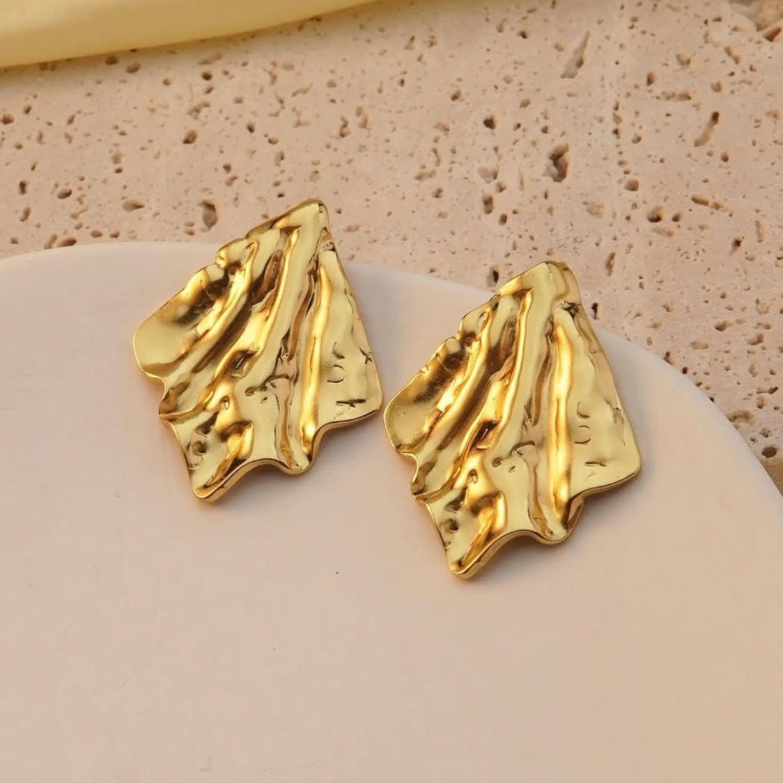 Inspired by fluid movement and sculptural elegance, the Gilded Ripple Studs feature a textured gold design that mimics the organic flow of molten metal. Bold yet refined, these earrings add a statement touch of modern luxury to any look.