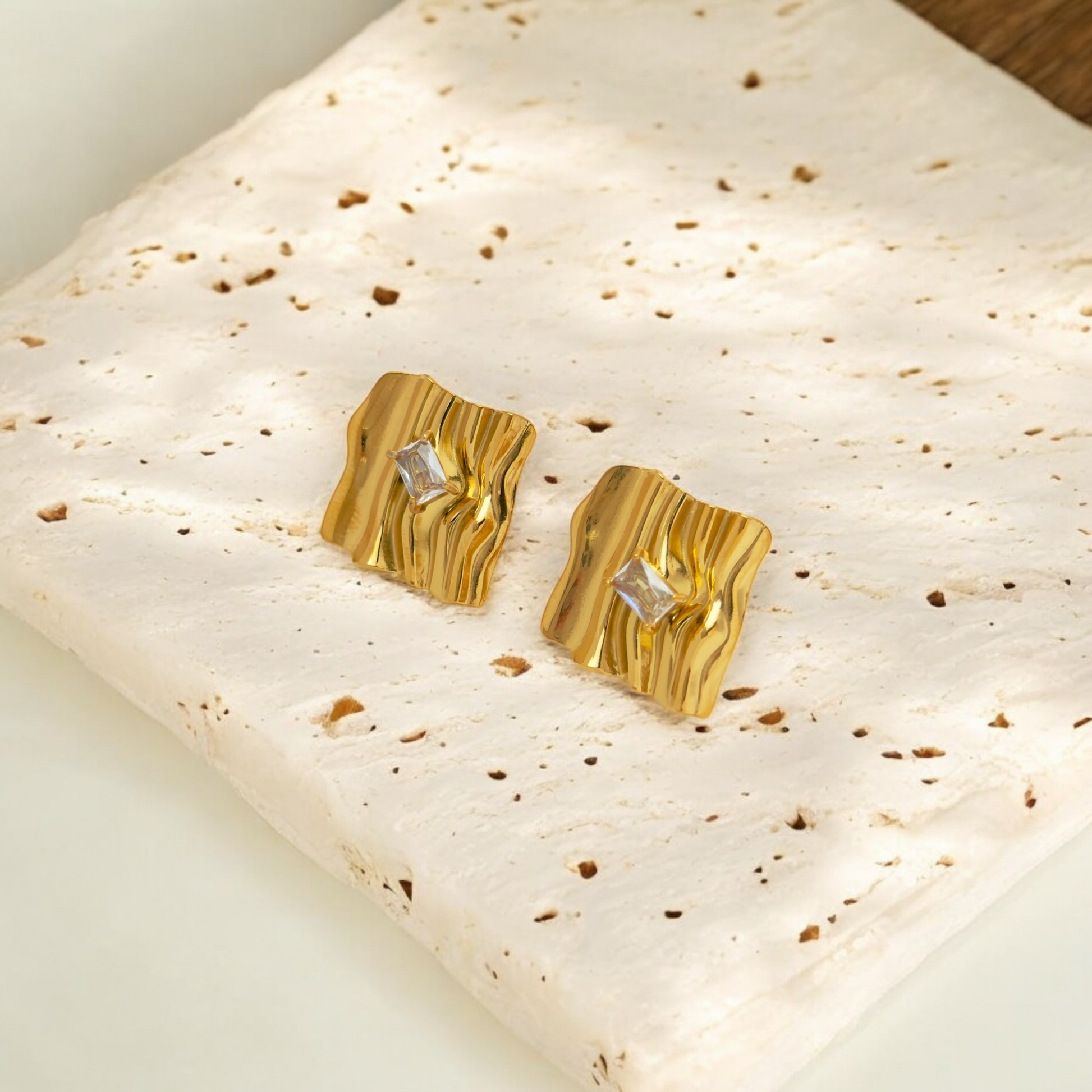 Inspired by the fluidity of draped fabric and molten gold, the Auric Drape Studs feature a sculpted, textured gold surface with a dazzling crystal accent. These earrings embody effortless luxury and artistic elegance, perfect for a bold yet refined statement.