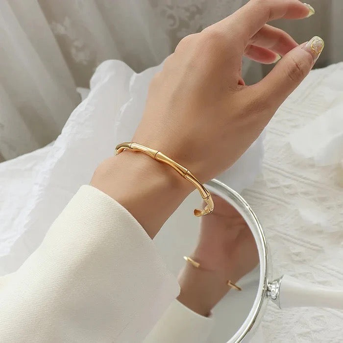 Elevate your style with the stunning Gold Bamboo Bracelet. Featuring interconnecting gold-toned bamboo segments, this elegant piece brings a touch of nature-inspired elegance to any outfit. Crafted with attention to detail, the high-quality construction ensures durability and long-lasting beauty. With its adjustable size, it's the perfect accessory for both everyday wear and special occasions.