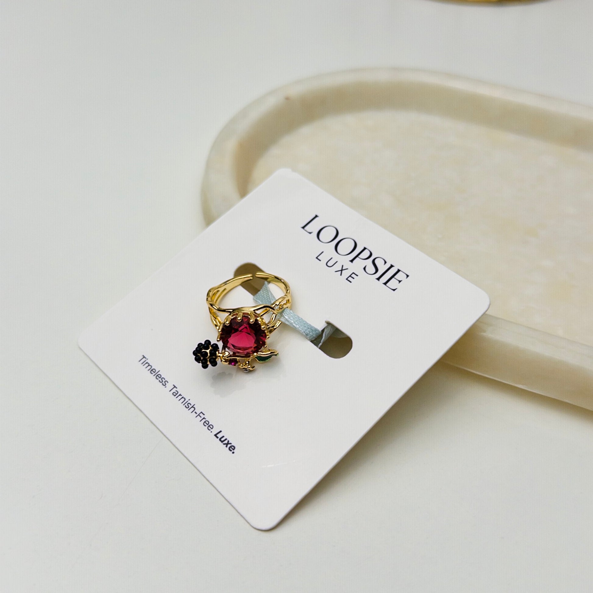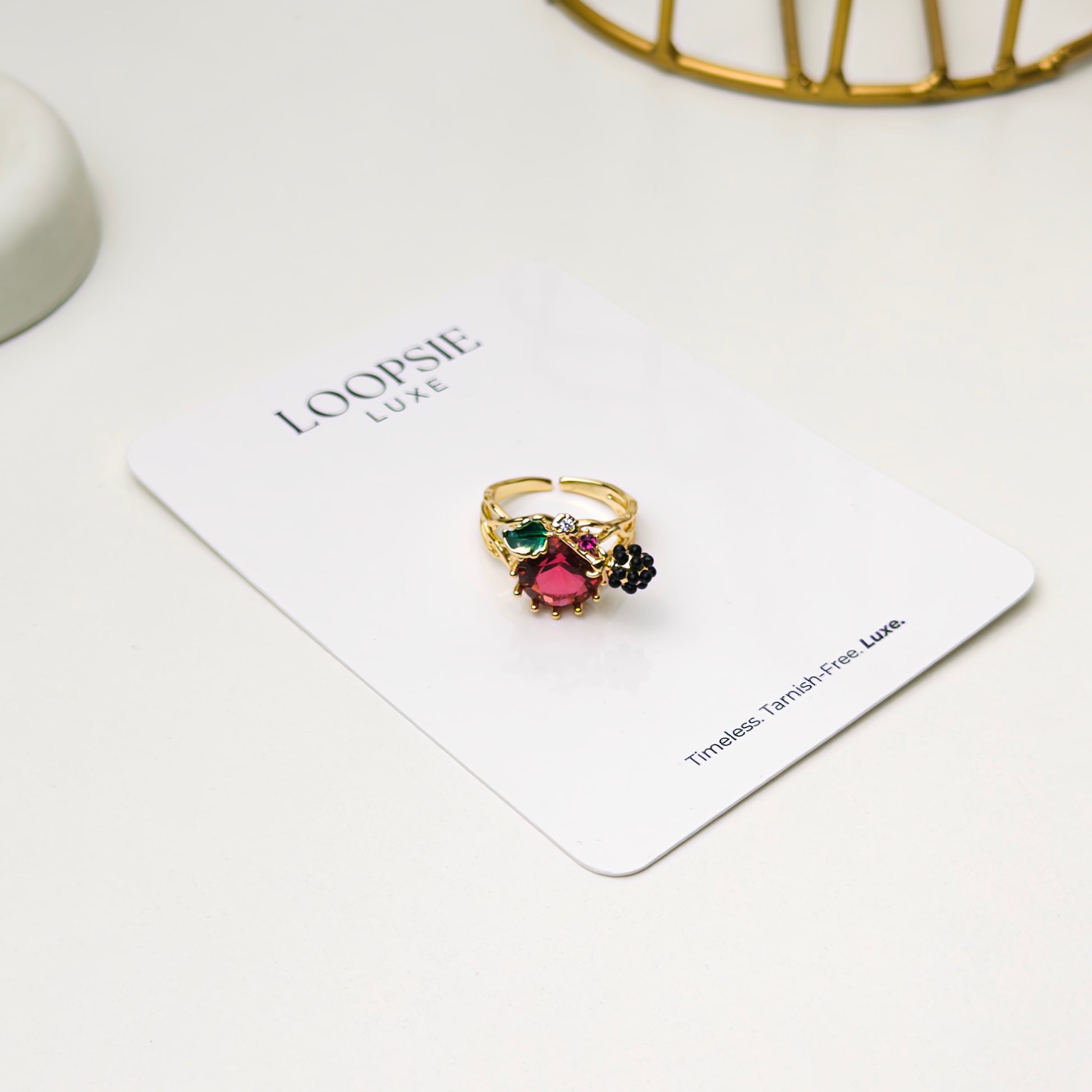Let your fingers steal the spotlight with the Berry Bloom Luxe Ring β a nature-kissed, regal statement piece designed to turn heads. The intricate golden vines wrap around your finger like art, while vibrant berry-inspired gems burst with color.