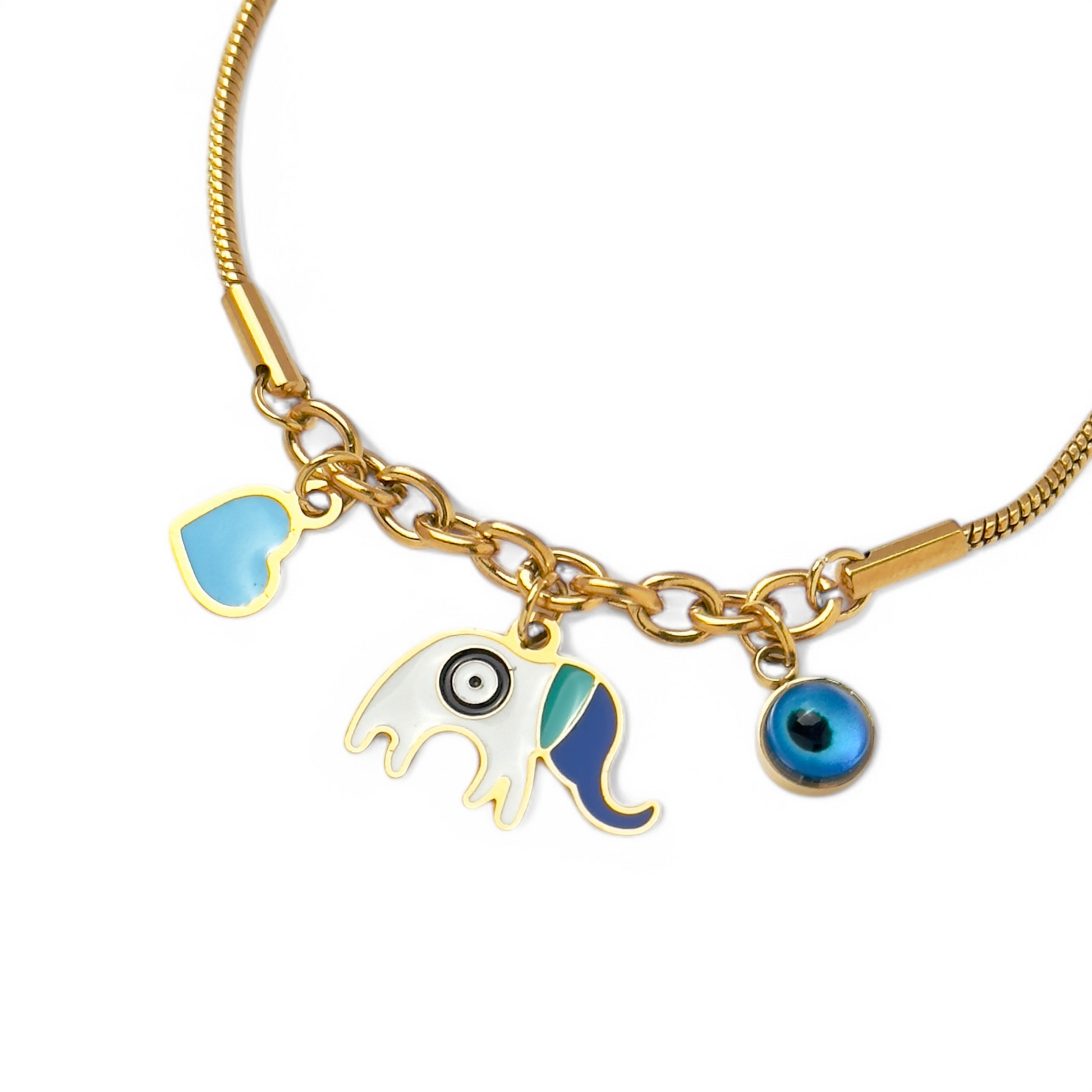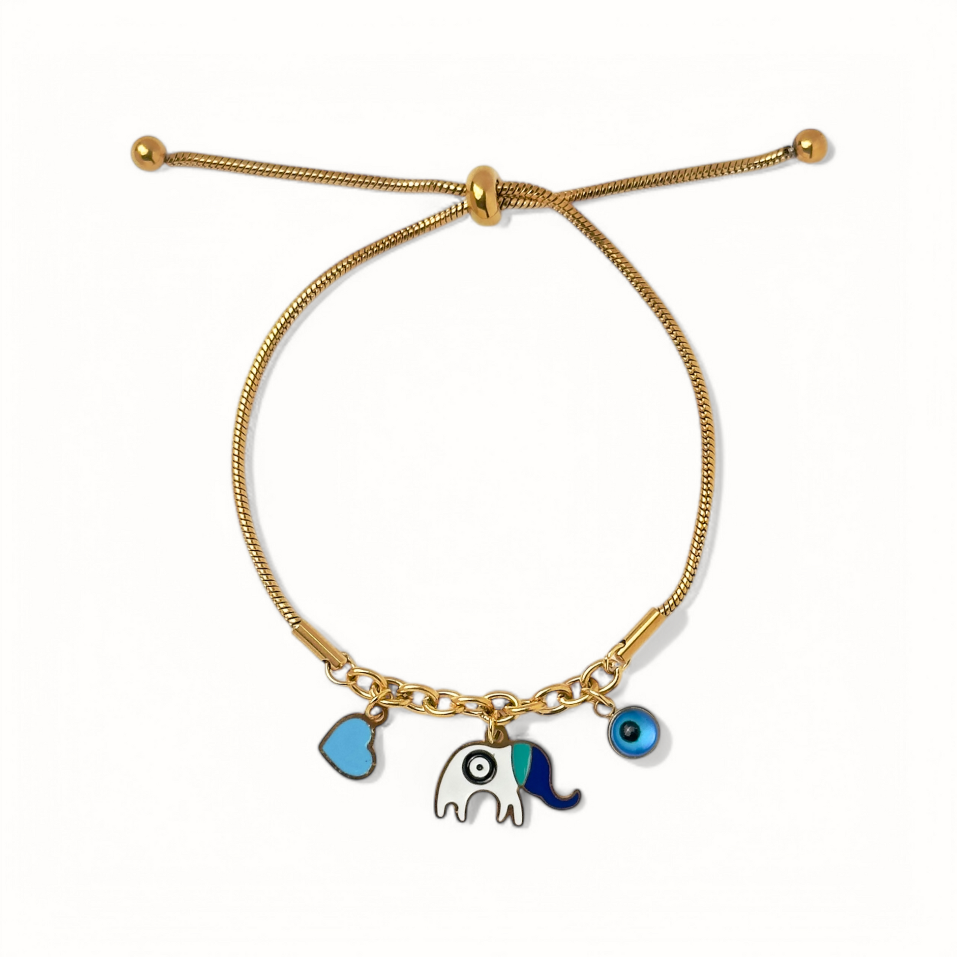 Embrace charm and positivity with theย EleCharm Braceletโa delicate gold bracelet featuring an adorable enamel elephant, an evil eye charm, and a dainty heart accent. Designed for elegance and protection, this piece is a symbol of luck, love, and strength. Perfect for stacking or wearing solo!