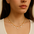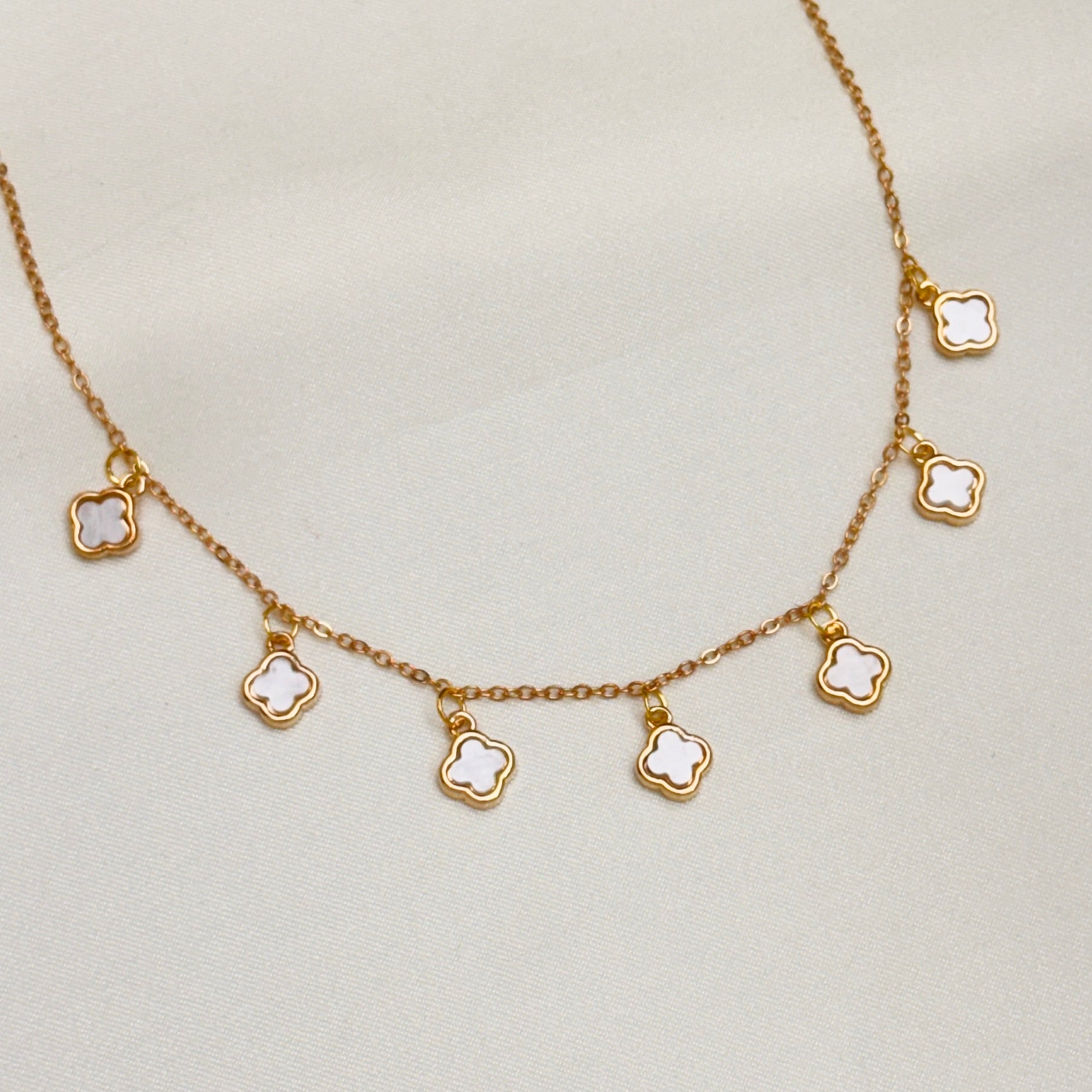 The Celestial Clover Necklace blends charm and grace in a cascade of glowing white clovers: