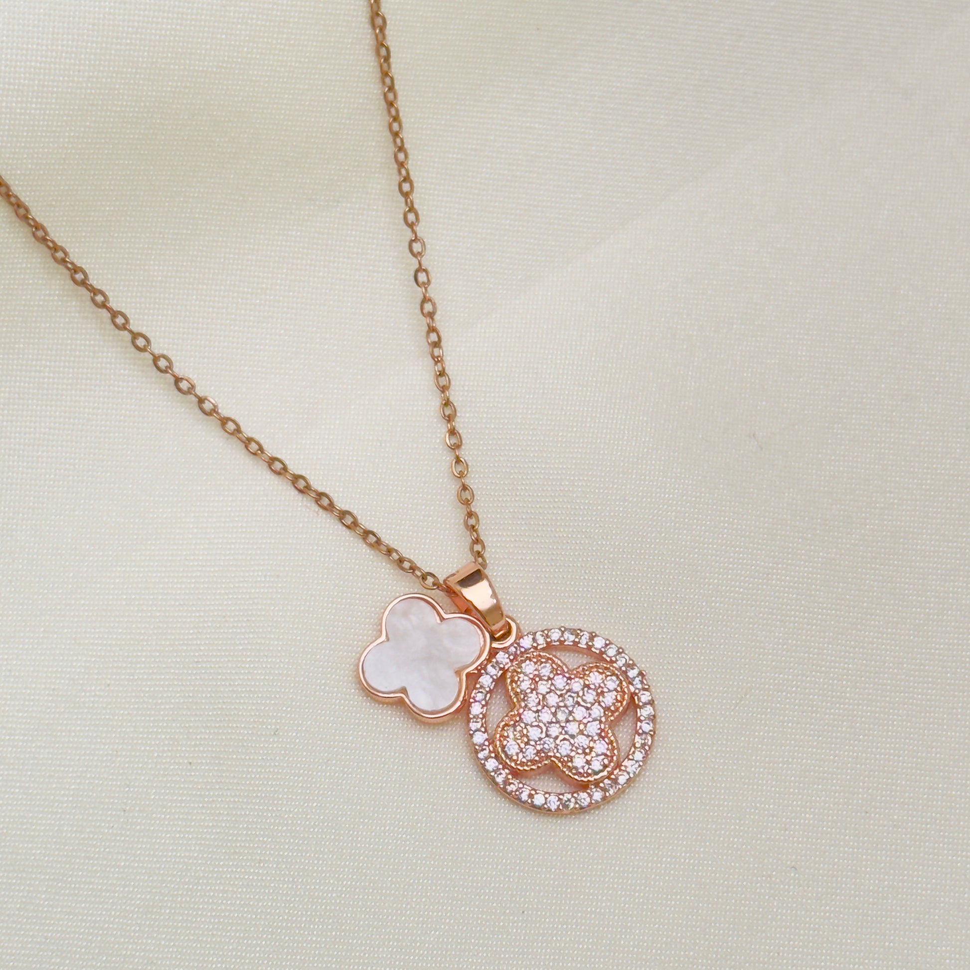 A blend of charm and shimmer, the Clover Gleam Necklace features a unique dual-pendant design: