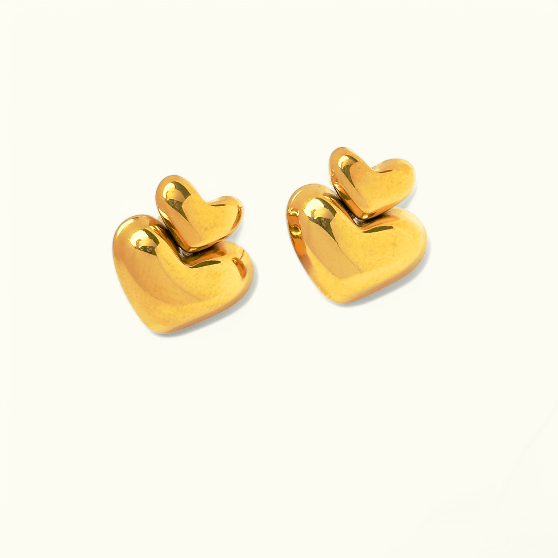 A radiant symbol of love, the Lustre Heart Studs feature a stunning double-heart design with a sleek, high-shine gold finish. Effortlessly elegant and timeless, these earrings add a touch of warmth and charm to any lookβperfect for everyday wear or a special occasion.