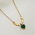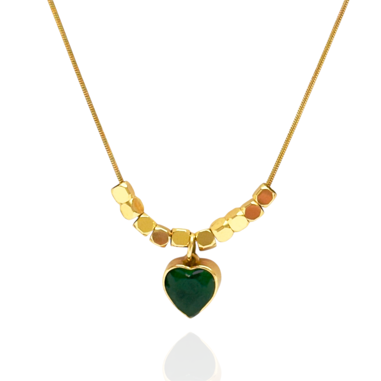 A modern fairytale in gold and green. The Emerelle Necklace features a brilliant emerald-toned heart set in a polished gold frame, resting between a series of geometric gold beads. Bold yet romantic, this piece adds a regal pop to any outfit and effortlessly blends softness with strength.