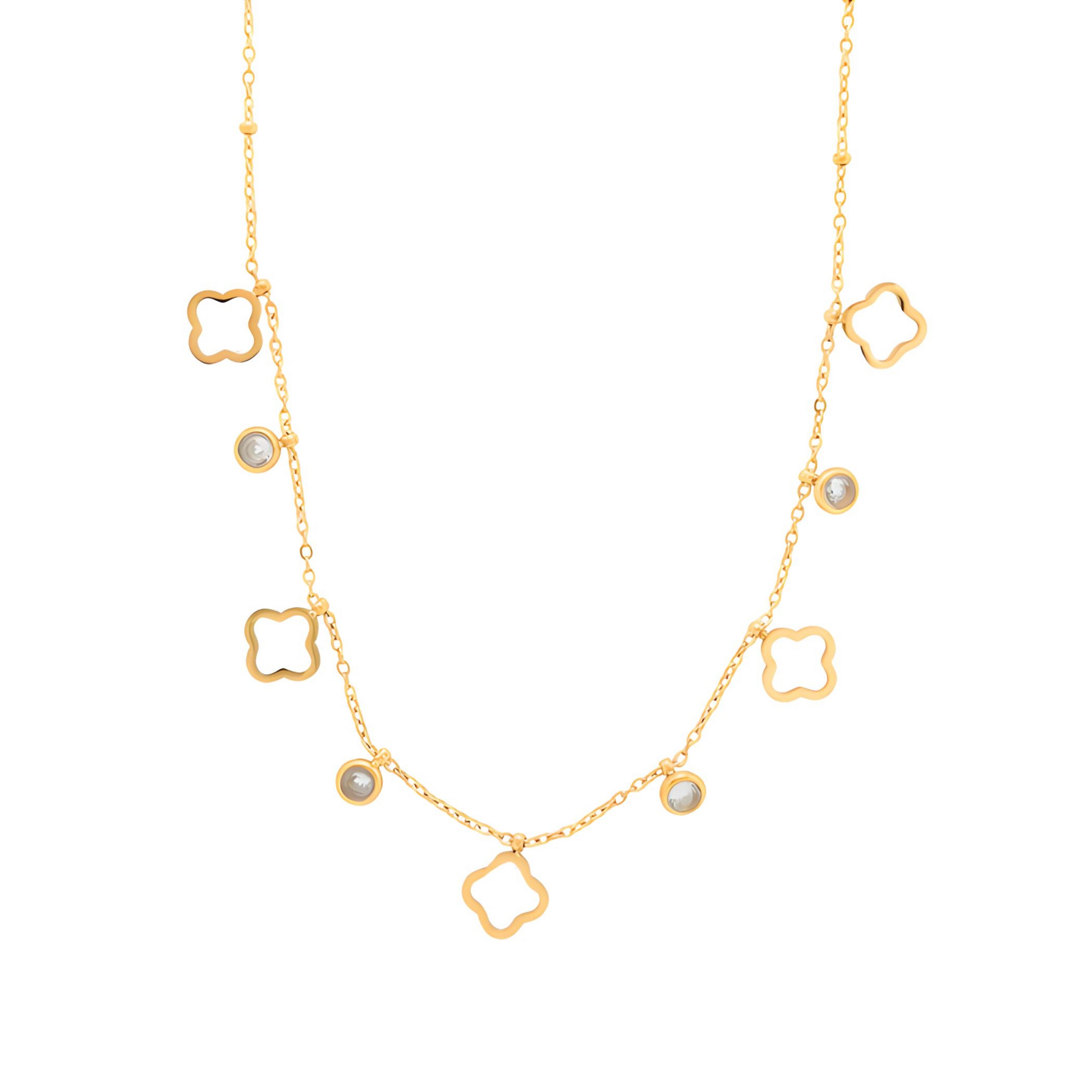 Elevate your everyday wardrobe with the exquisite Dainty Clover Necklace, designed to embody both elegance and good fortune. The gold-tone chain is meticulously adorned with sparkling clear cubic zirconia stones, adding a touch of sophistication. Expertly crafted from high-quality, anti-tarnish stainless steel, this delicate necklace features dainty four-leaf clover charms that dangle gracefully. Versatile and refined, this enchanting necklace is perfect for those seeking a subtle yet meaningful accessory. Wear it alone or layer it with other pieces, the Dainty Clover Necklace is sure to become a treasured favorite.