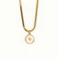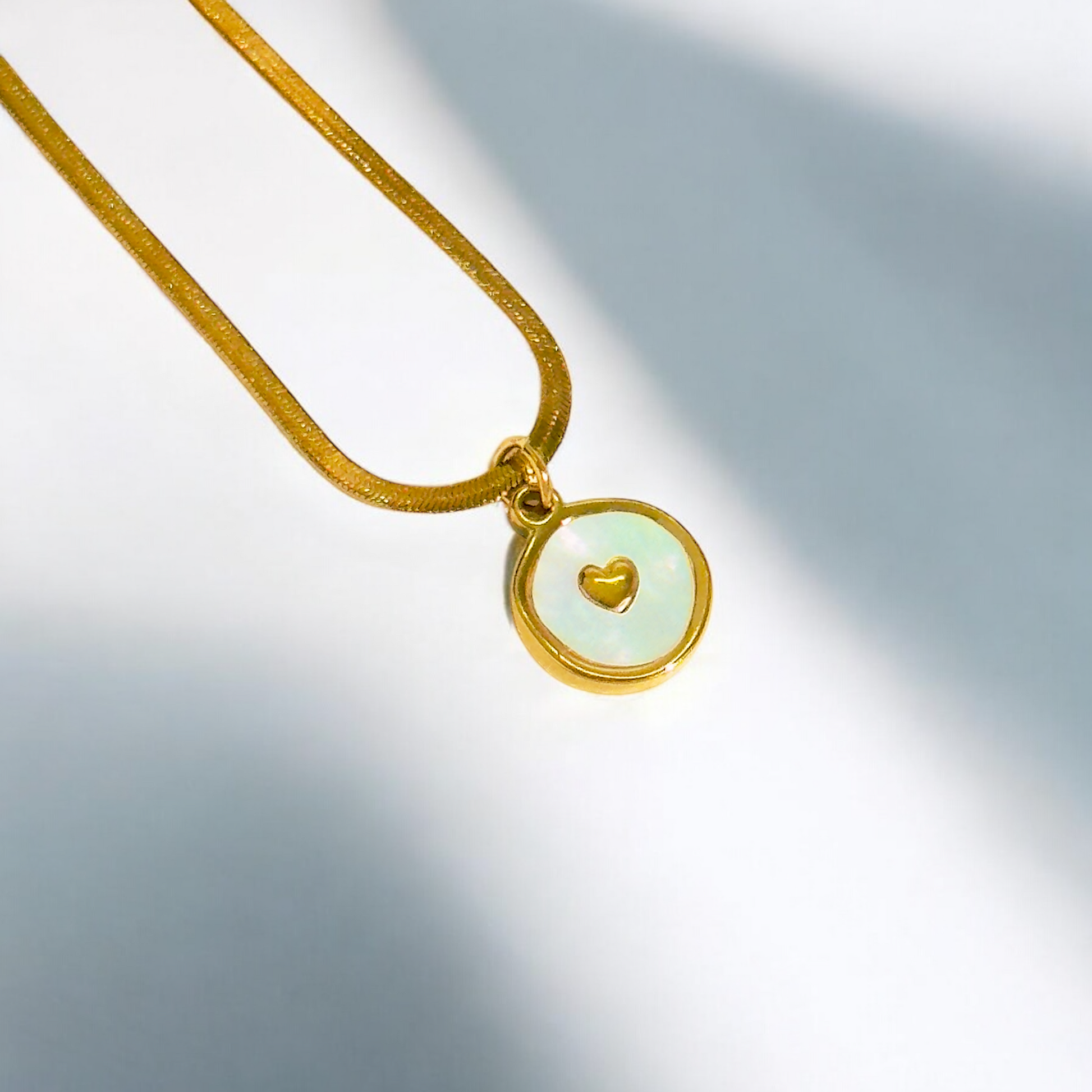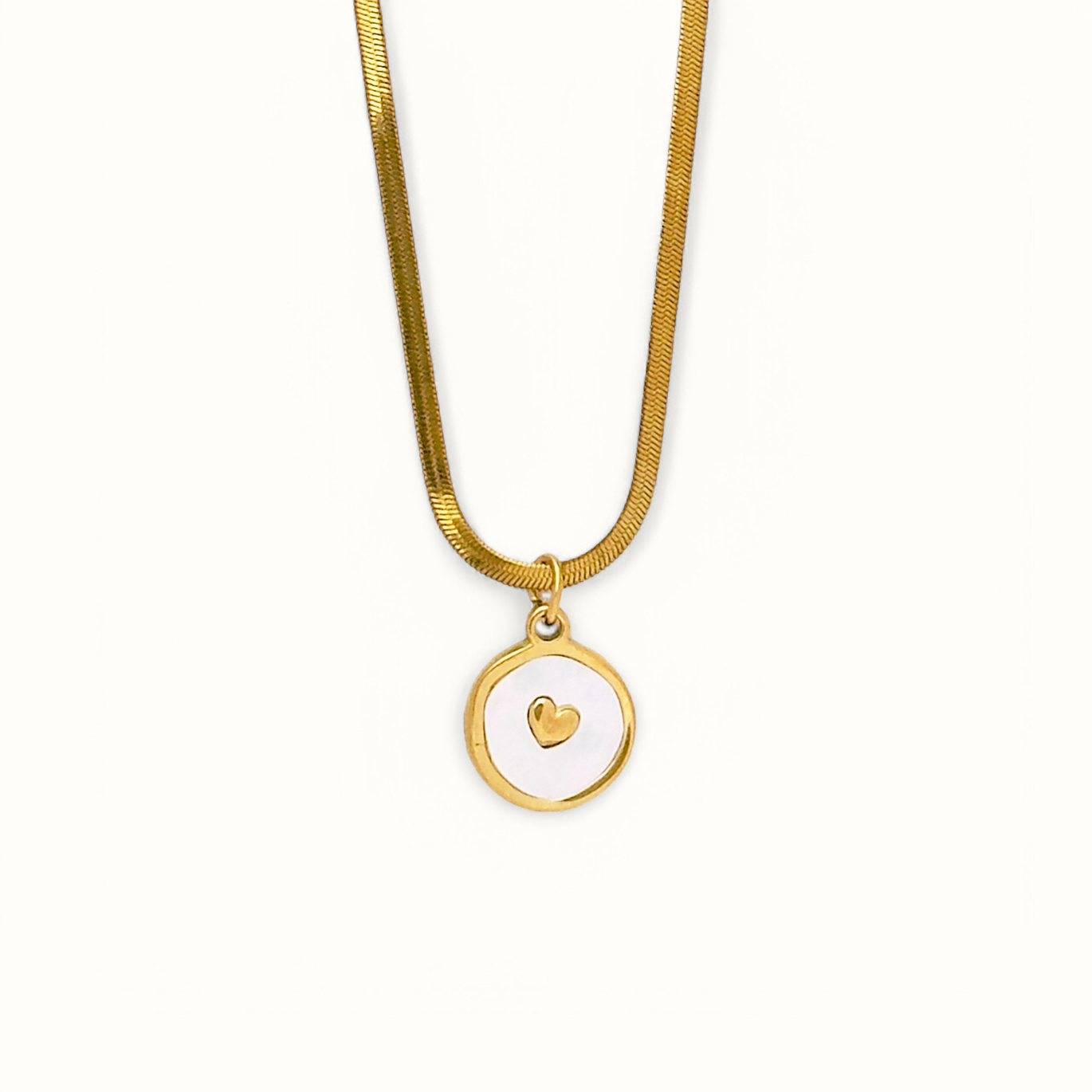 A blend of vintage charm and modern elegance, the Enchanted Heart Necklace features a golden heart emblem set against a sleek enamel medallion, suspended from a refined snake chain. A perfect piece to add romance and sophistication to any look.