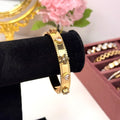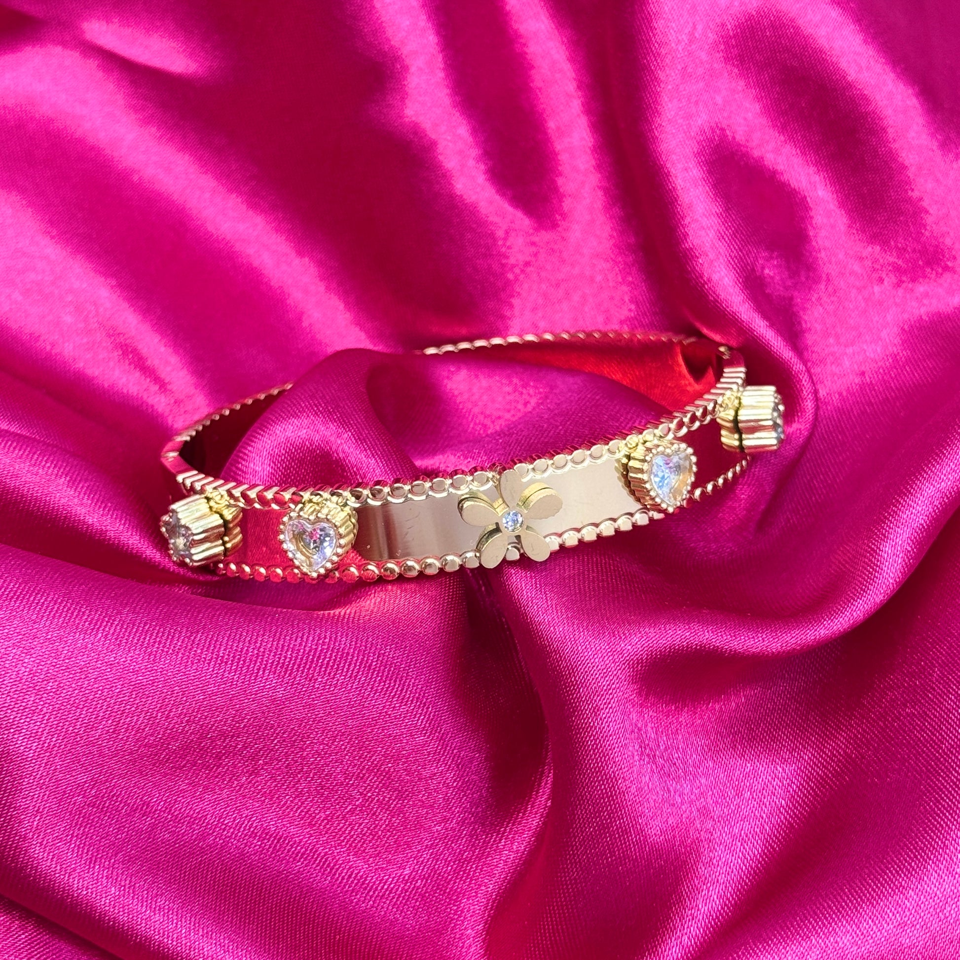 The Floret Glow Bracelet is a stunning blend of elegance and charm, crafted with intricate floral motifs and a radiant golden finish. Designed from premium, anti-tarnish stainless steel, it offers lasting durability and brilliance. The seamless flow of delicate flowers and sparkling accents makes it a perfect accessory for elevating both casual and formal looks. With its timeless beauty and graceful design, the Floret Glow Bracelet adds a touch of sophistication to your jewelry collection.