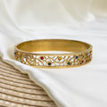 Indulge in a moment of serenity with the Gemstone Oasis Bracelet. Made from premium stainless steel, this luxurious bangle features a stunning blend of expertly curated gemstones in a vibrant array of colors. With its sleek gold-tone finish and attention to detail, it's the perfect statement piece for any occasion.