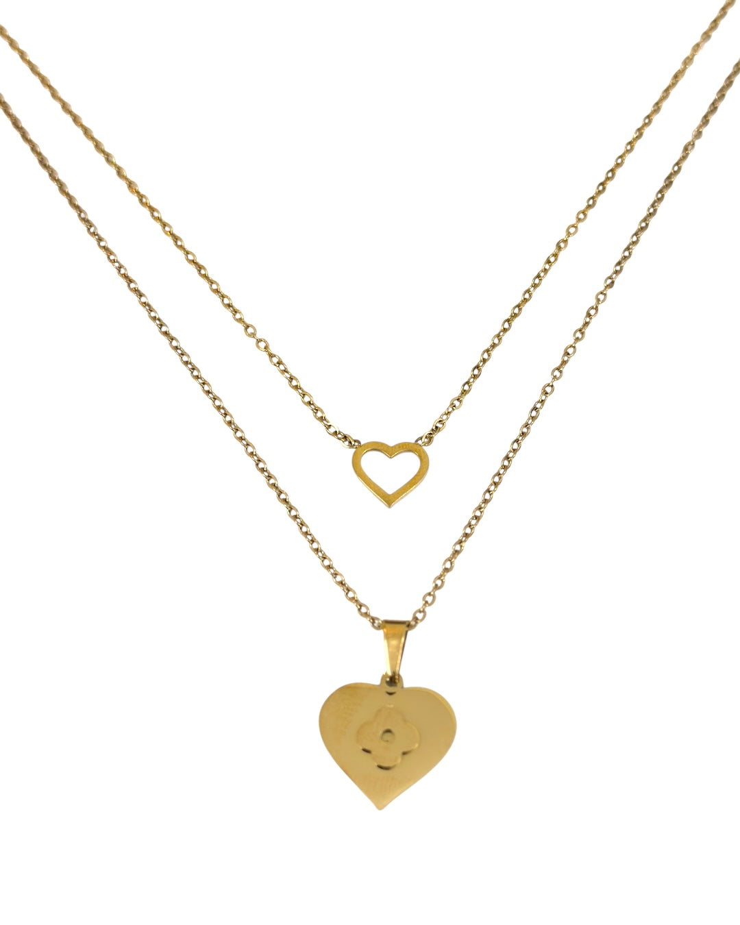 A classic layered necklace combining a delicate open heart chain with a bold heart pendant for a balanced, modern look.