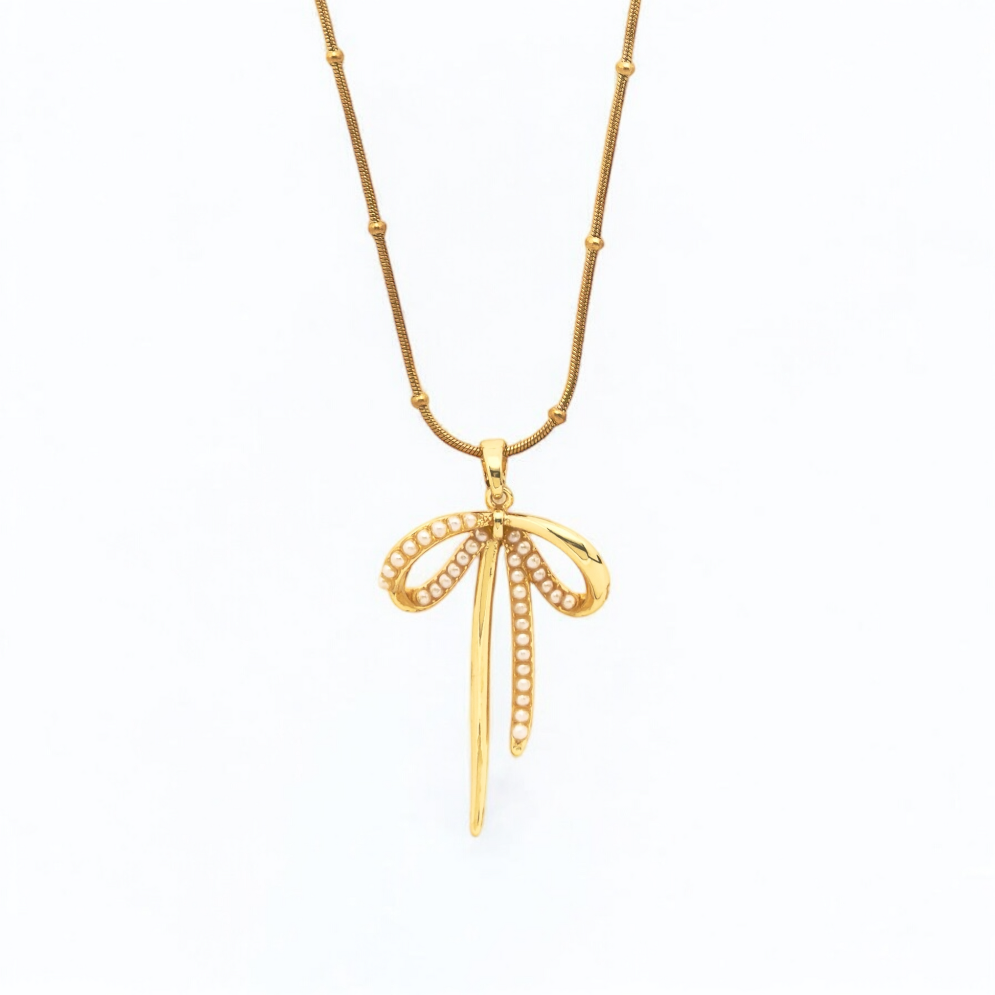 Unveil timeless elegance with theΒ Golden Pearl Bow Necklace, a radiant blend of sophistication and charm. This stunning piece features a bow-shaped pendant crafted in lustrous gold, delicately adorned with intricate pearl detailing that adds a touch of classic allure. Paired with a sleek, beaded gold chain, this necklace is the perfect harmony of opulence and modern grace. Whether for an evening gala or a chic casual look, this necklace effortlessly elevates any outfit with its refined beauty.