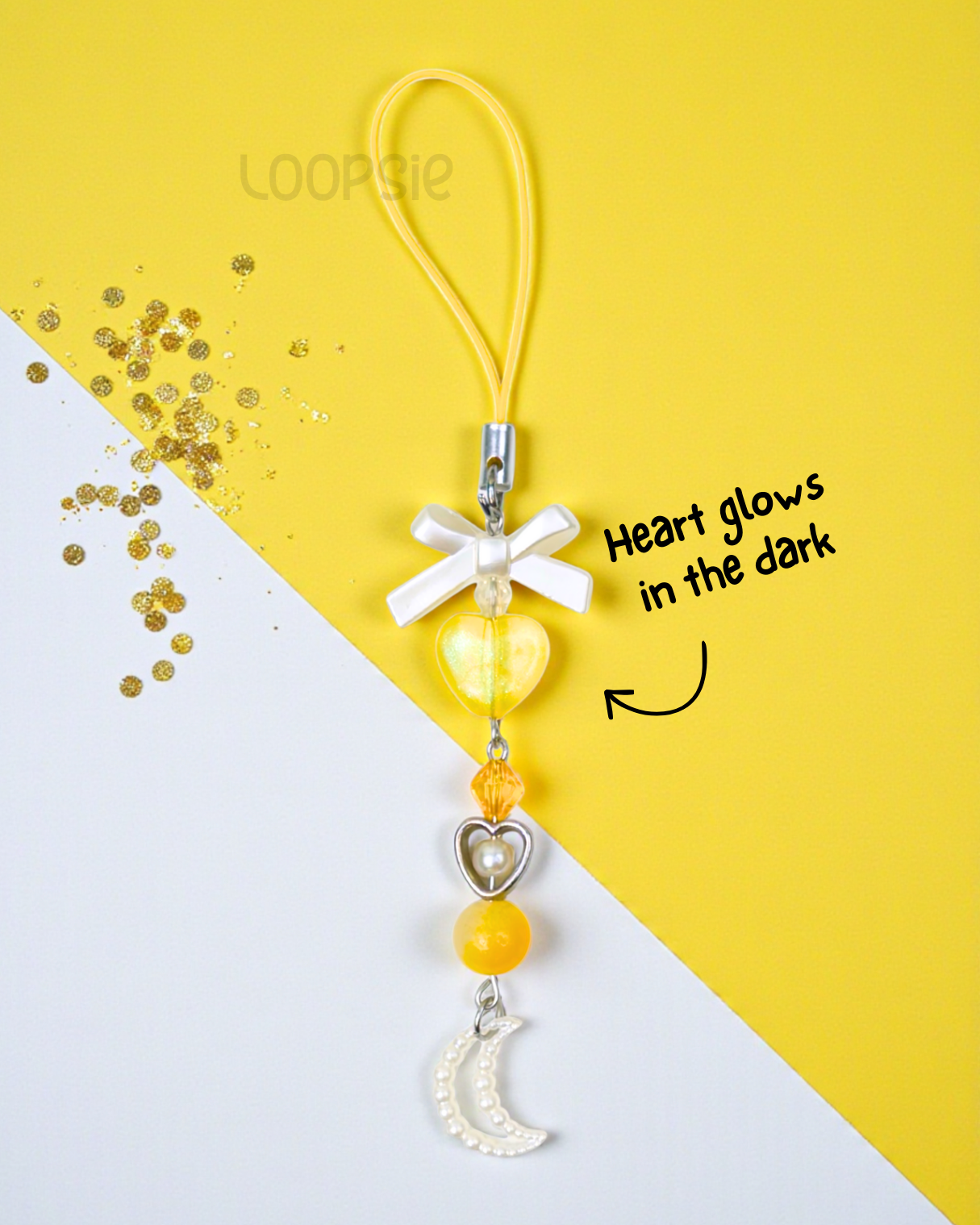 Warm, glowing, and enchanting—this charm brings together golden-yellow pearls, heart accents, and a delicate crescent moon for a soft fairy-core glow. Finished with a sweet bow and crafted using stainless steel, it’s designed to last while adding a sunny, magical touch to your phone, bag, or keys.