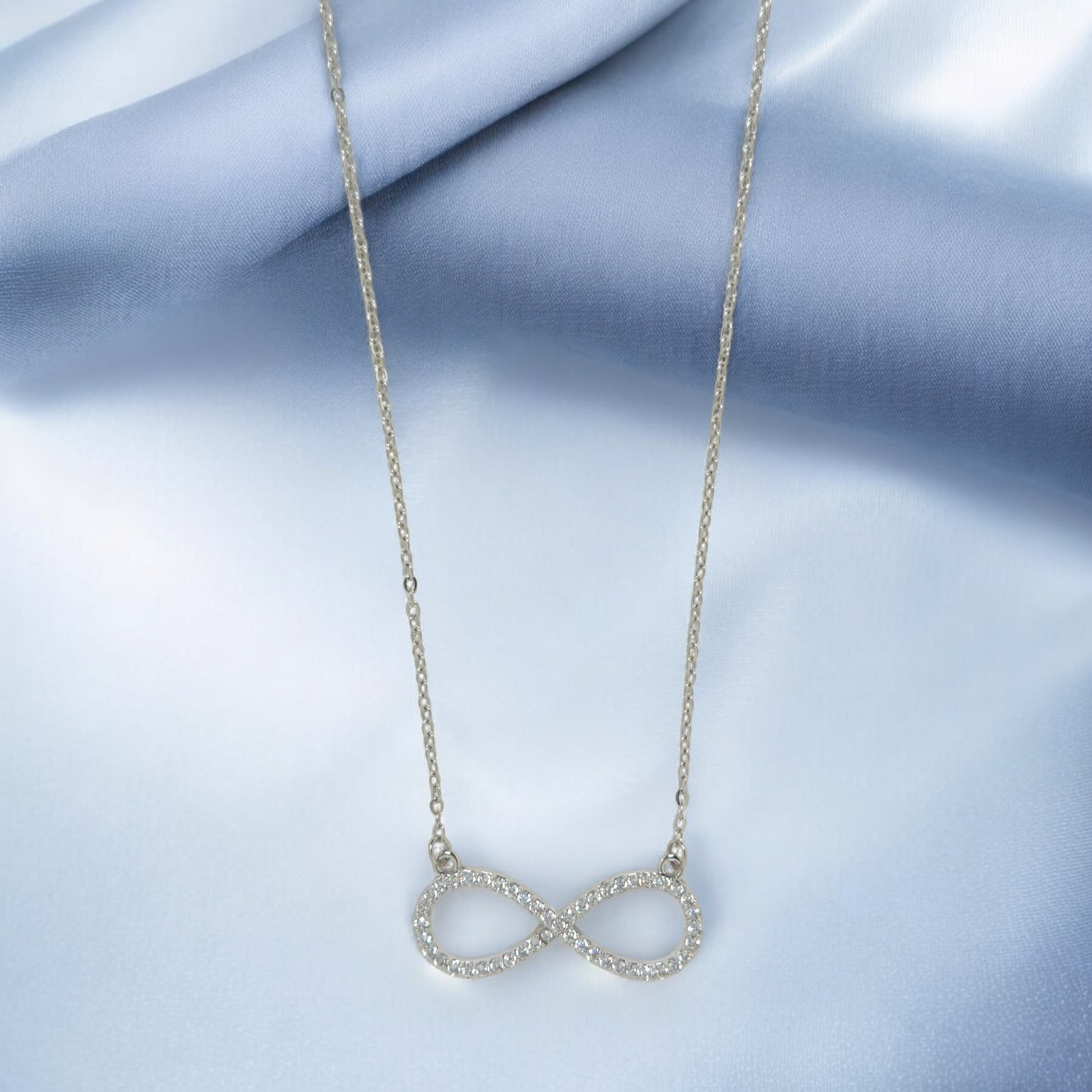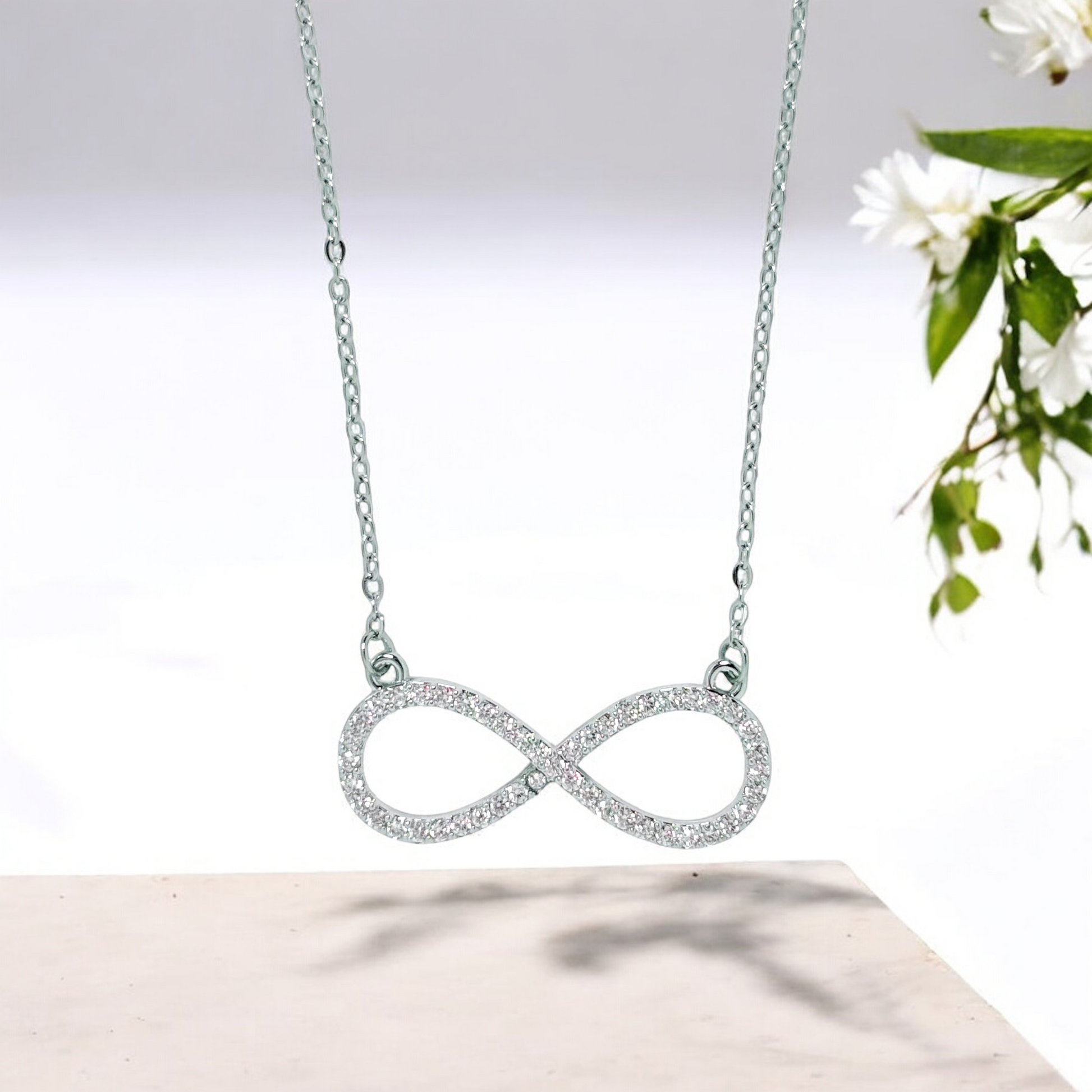 Celebrate endless love, strength, and connection with the Silver Infinity Glow Necklace. This brilliantly crafted infinity pendant, encrusted with dazzling cubic zirconia stones, symbolizes forever and adds the perfect touch of elegance to any outfit.