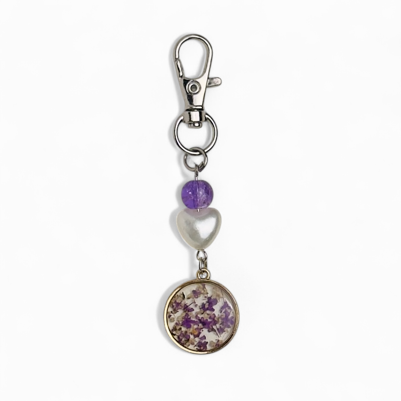Soft purple flowers give this charm a dreamy, calming vibe, paired with a lilac bead and pearl heart for an extra delicate touch. Crafted with resin and stainless steel findings, itβs perfect for adding a little magic to your daily essentials.