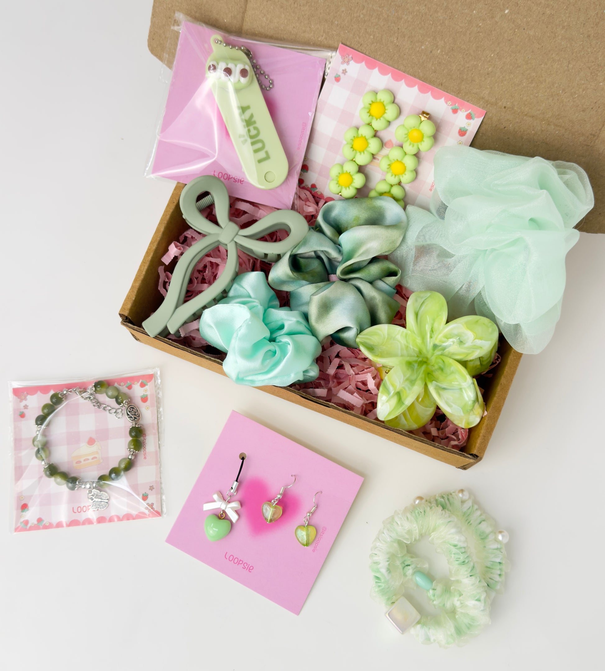 Each JoyBox includes a mix of cute accessories — like scrunchies, clips, mini charms, and a handcrafted piece. It’s a curated surprise, not a fixed set!