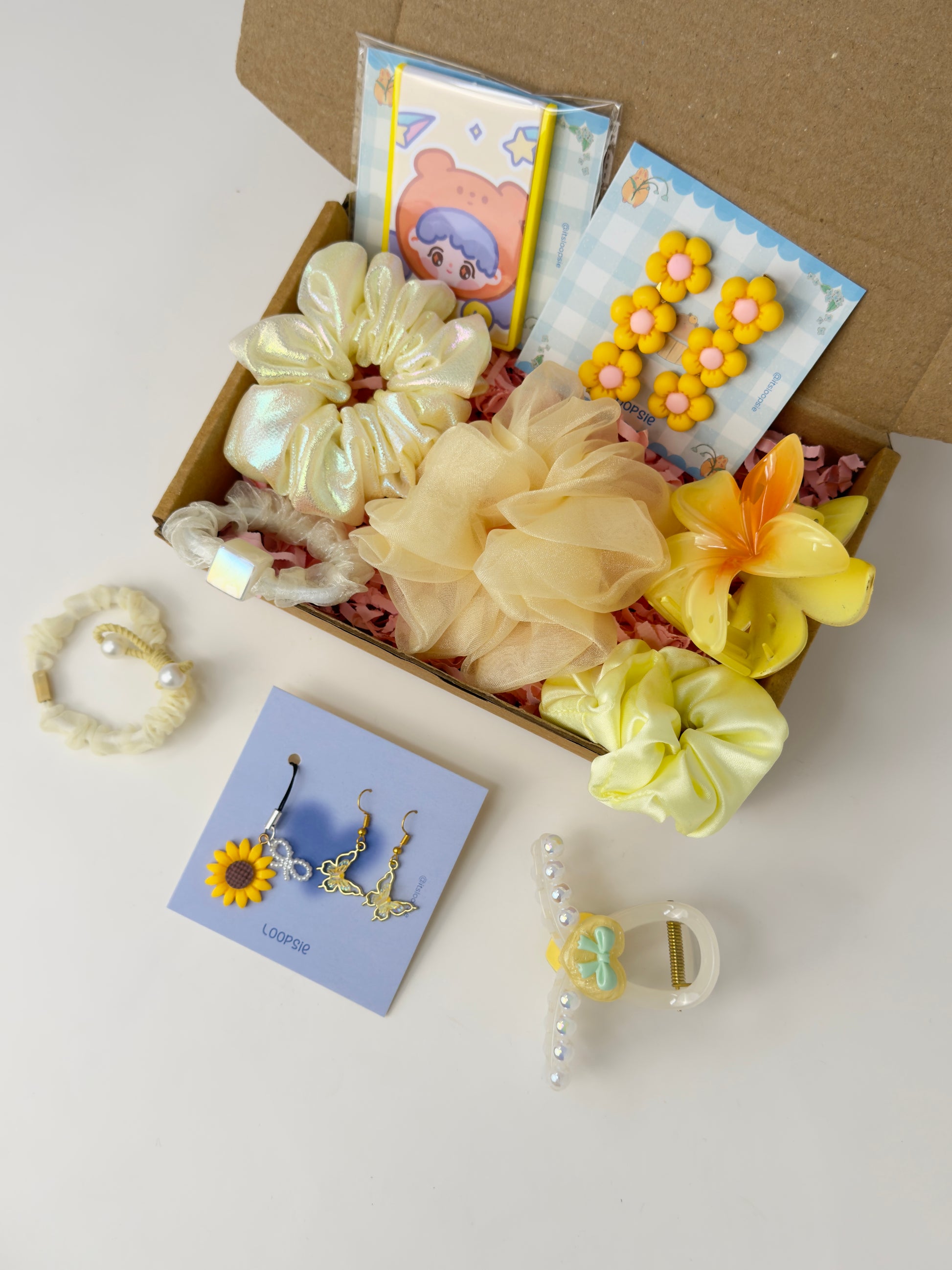 Unbox sunshine in a box — a bright, happy mix of accessories made to bring the good vibes in every strand, scrunch, and sparkle! ☀️💛