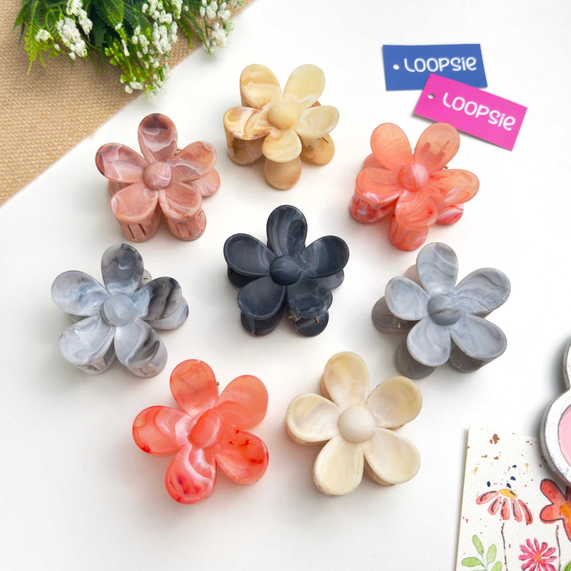 Marble Daisy Claws — a playful twist on everyday styling. Designed in a charming daisy shape with smooth marble-like patterns, these statement claws are perfect for holding your hair in place while turning heads.