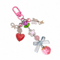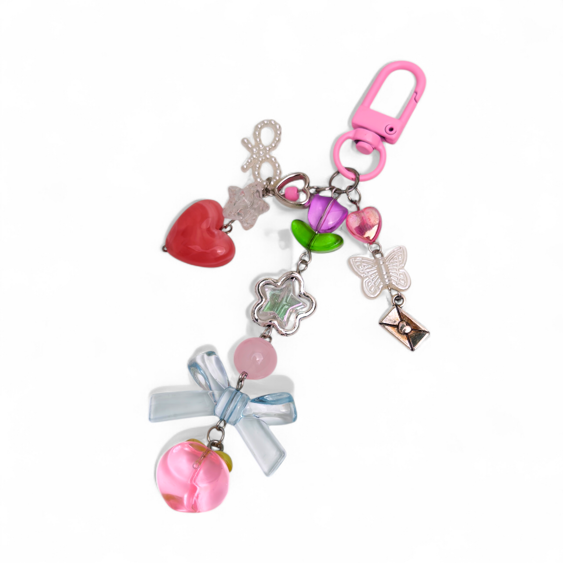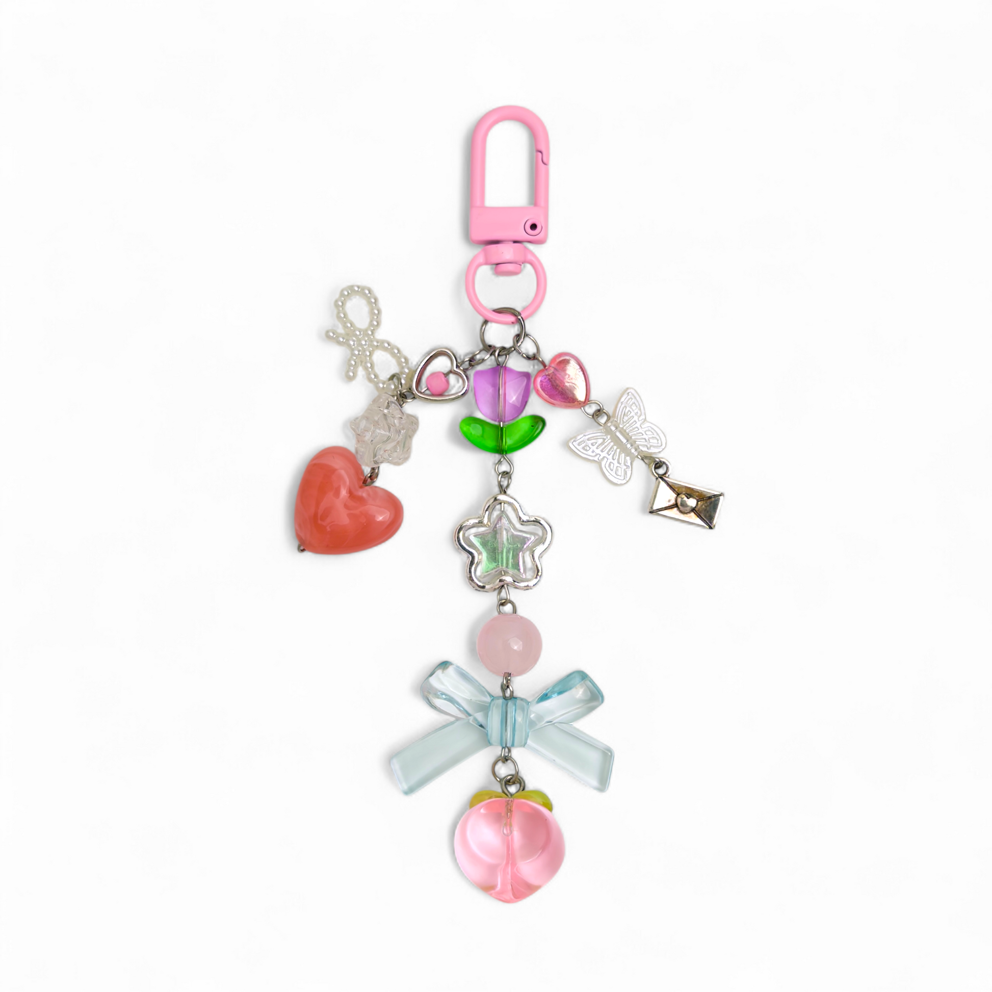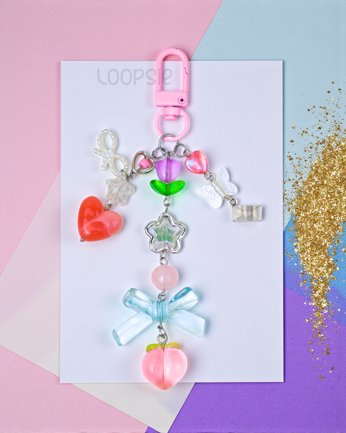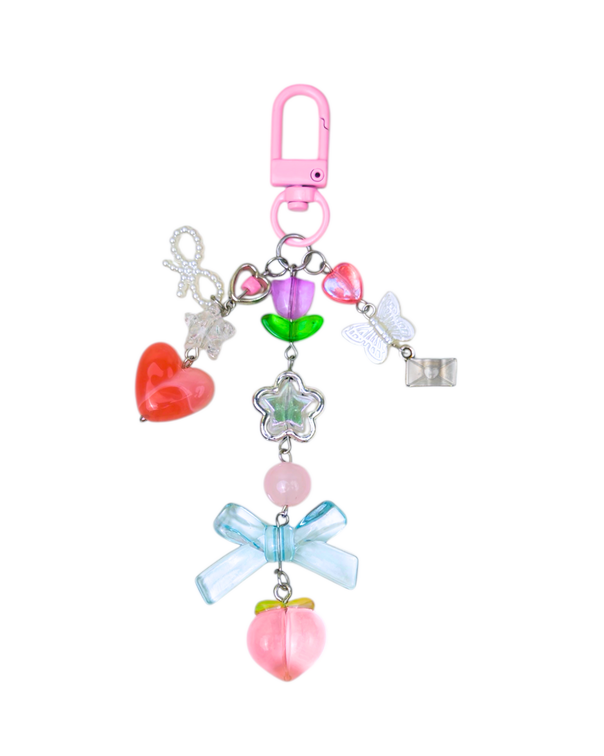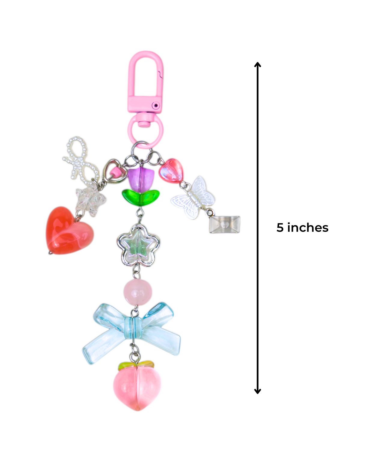 Add a soft, dreamy touch to your everyday carry with this handmade bag charm featuring a glossy peach, a tulip bloom, a crystal-clear bow and heart accents. Built with high-quality stainless steel findings, it is designed to stay bright, secure and rust-resistant through daily use.
