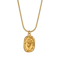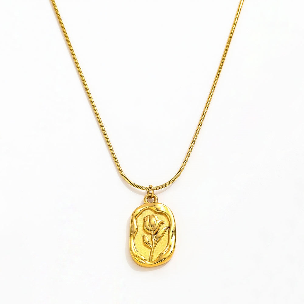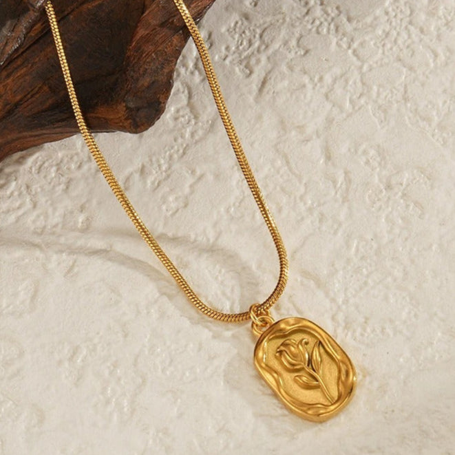 The Rose Medallion features a sculpted tulip pressed into a molten gold-toned pendant — a poetic blend of vintage charm and modern elegance.