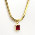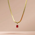 Elevate your style with our Ruby Statement Necklace. Featuring a delicate yet sturdy gold-tone herringbone chain, this necklace is perfect for everyday wear. The highlight is the stunning square-cut red cubic zirconia pendant, adding a touch of glamour to any outfit. Designed to make a statement, adding sophistication to your look.
