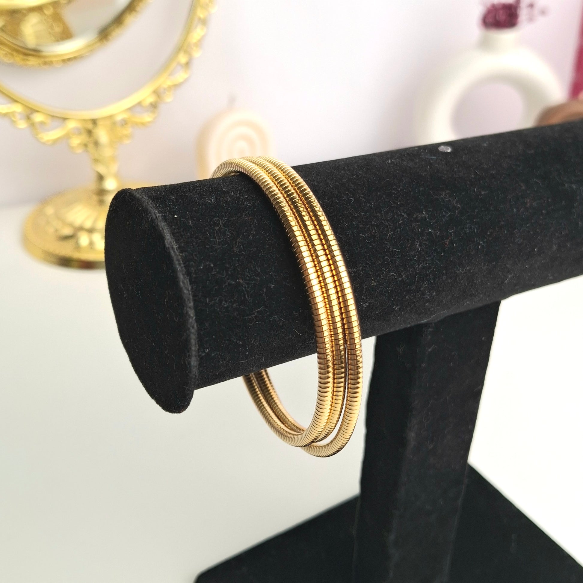 The Serpent Glow Bracelet features three fluid coils with a polished snake-like texture that wraps around your wrist effortlessly. Crafted from anti-tarnish stainless steel, it’s designed to retain its shine through seasons of styling.