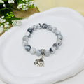 This elegant bracelet features a delicate string of white Howlite beads with intricate swirls of gray and black. The beads are finished with a polished sheen, giving them a smooth and luxurious feel. A charming silver elephant charm adorns the bracelet, adding a touch of whimsy and symbolism. The elephant is a symbol of good luck, wisdom, and strength in many cultures. This bracelet is perfect for adding a touch of sophistication and meaning to any outfit.