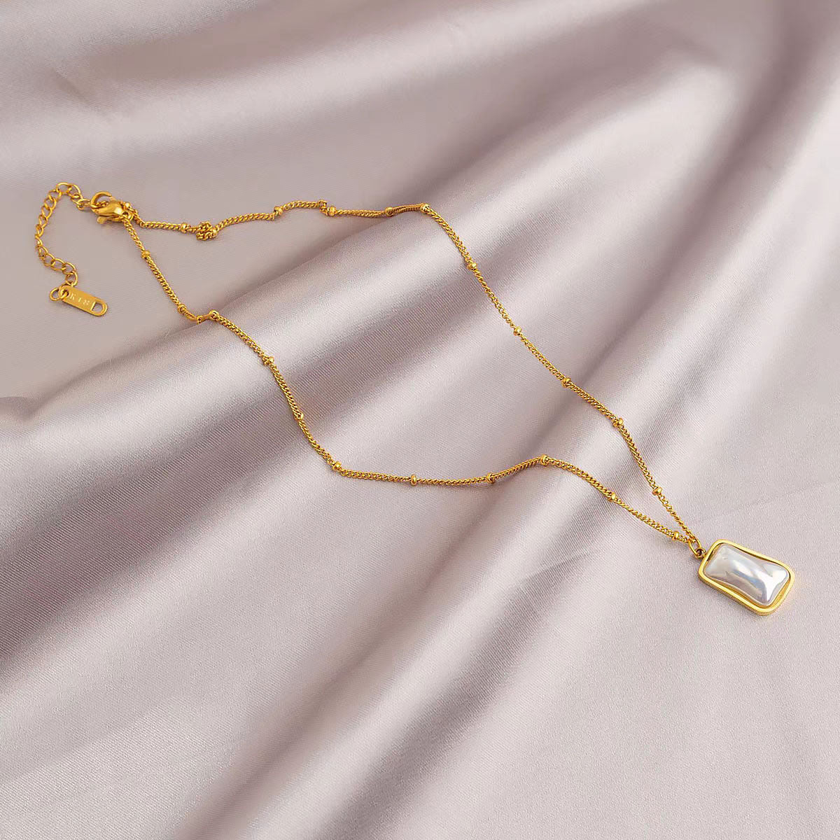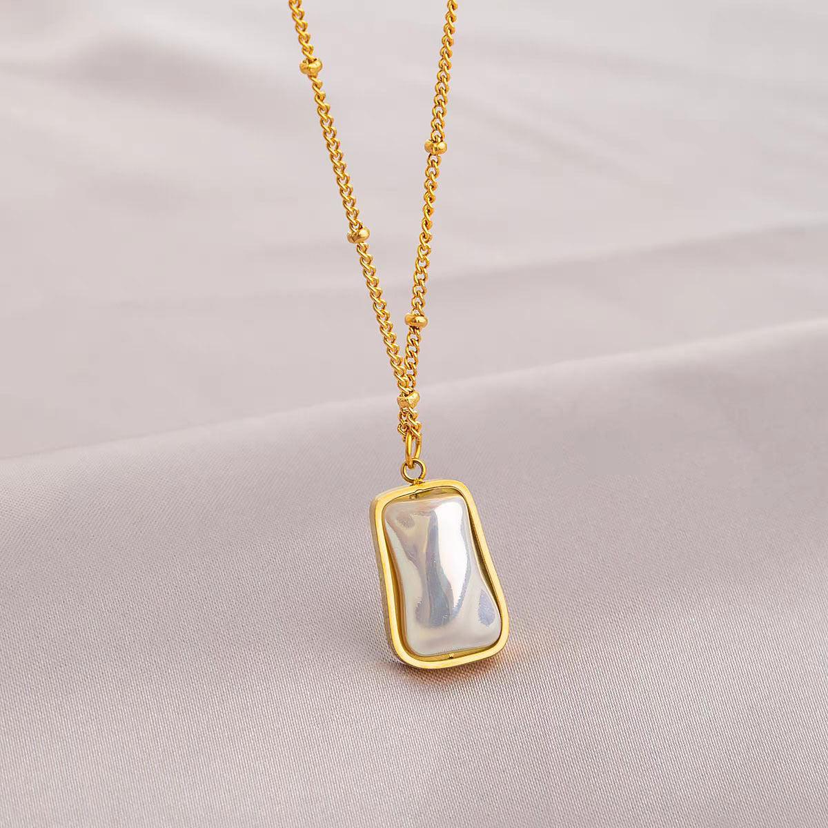 A timeless ode to elegance – the Mira Pearl Necklace captures effortless grace in every curve. Featuring a glossy, organic-shaped pearl set in a smooth gold bezel and suspended from a delicate beaded chain, this piece radiates a subtle shimmer that moves with you.
