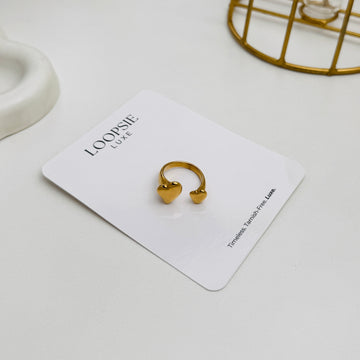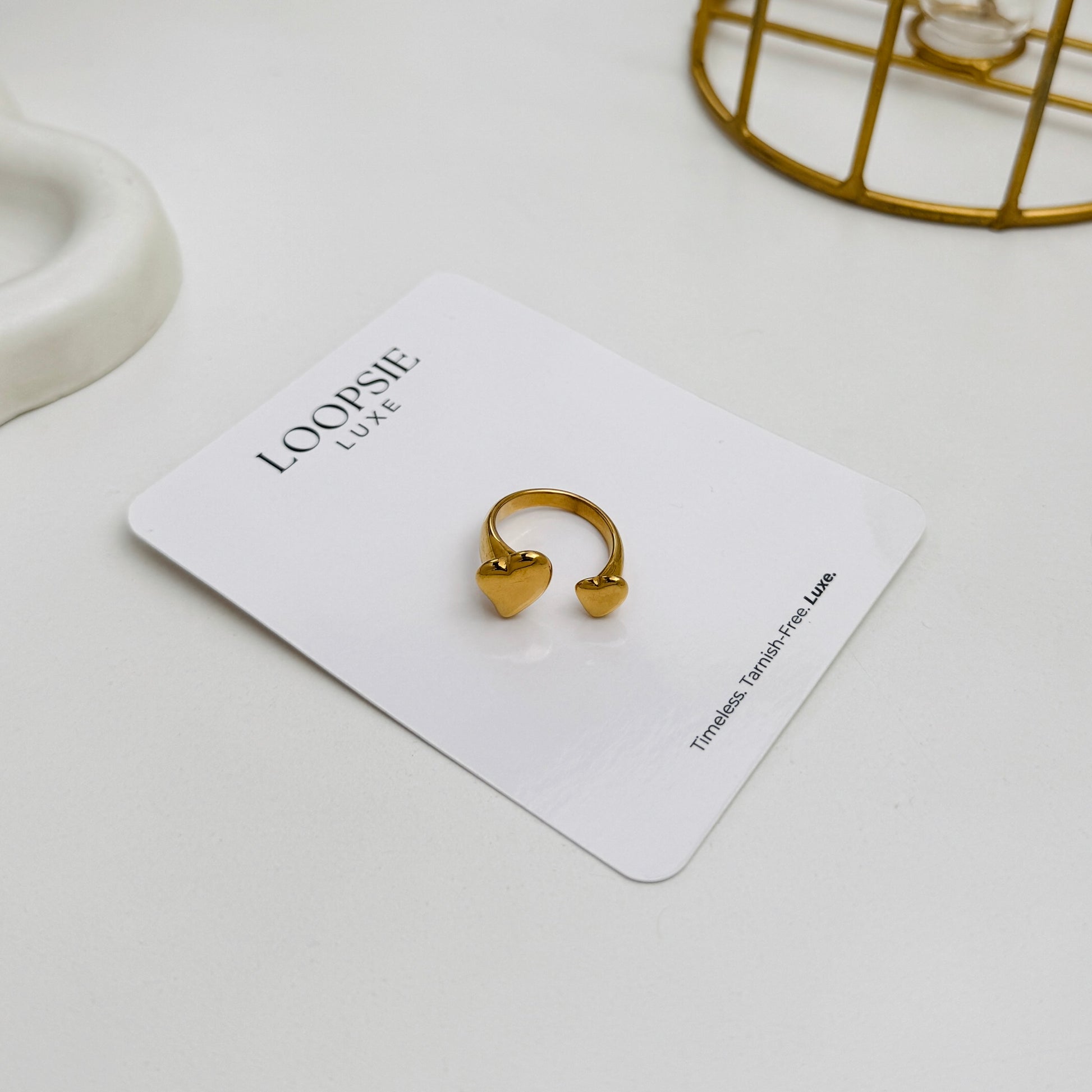 The TwinHeart Bold Ring is a chunky open-band design finished with two puffed hearts β a minimal yet playful statement piece that captures the duality of soft and strong.