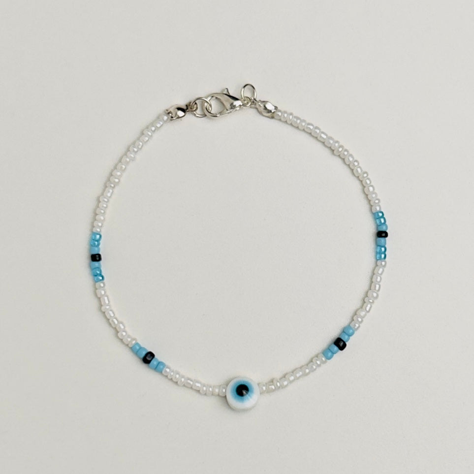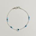 A modern protective charm – this Evil Eye Anklet features minimalist white, blue, and black beads centered with an eye bead for daily good vibes.